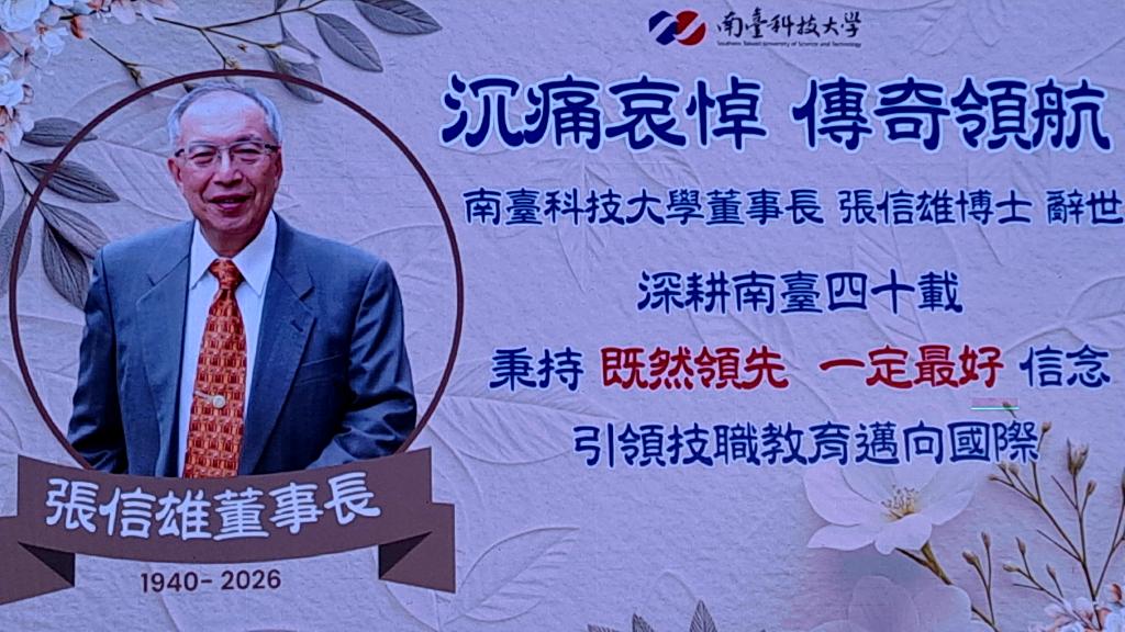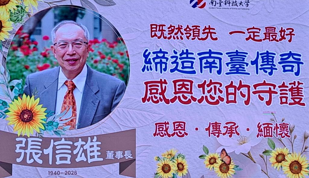 【勁報記者于郁金/臺南報導】帶領南臺科技大學締造無數第一、被譽為臺灣技職教育推手張信雄董事長,於今年3月13日辭世;南臺科大於4月13日上午假校內N棟音樂廳舉行「張信雄董事長追思感恩紀念會」;現場包含張董事長家屬、臺南紡織侯博明董事長等產學界貴賓,及韓國東岡大學代表許淑國際長皆親臨致哀,全校師生與歷屆校友齊聚,在莊嚴氣氛中緬懷永遠南臺大家長。