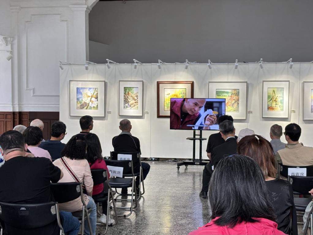 ▲「重生與共生:從生活美學到環境教育之藝術實踐」影像發表會現場,影片中藝術家范揚清正專注於白鷺鷥創作。(圖/竹美館提供)