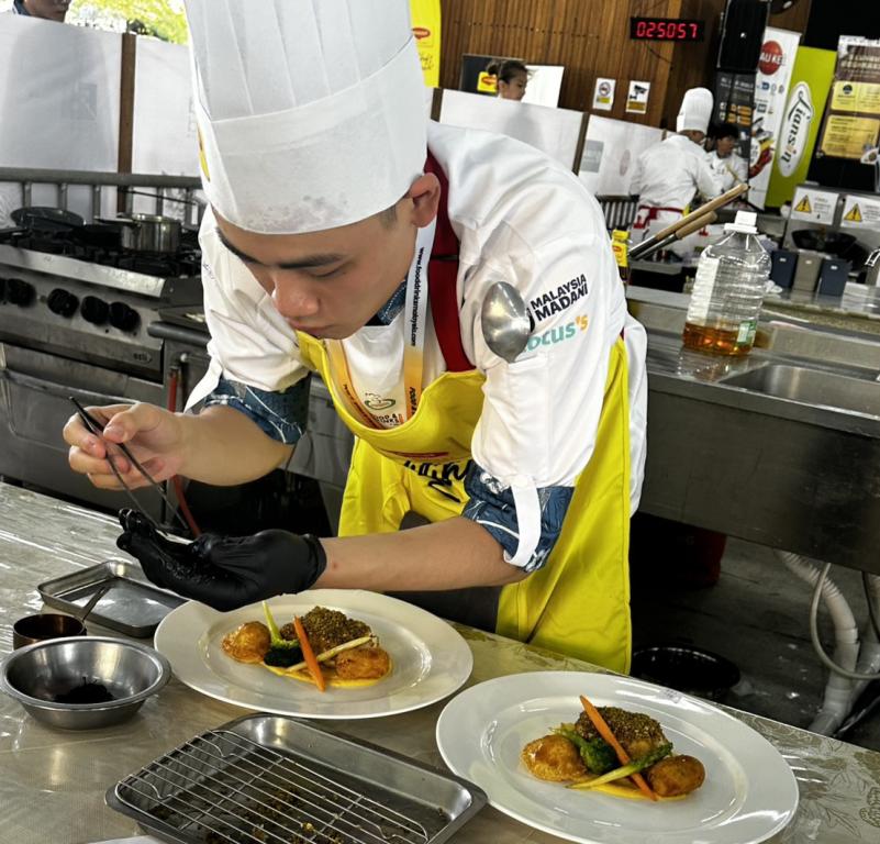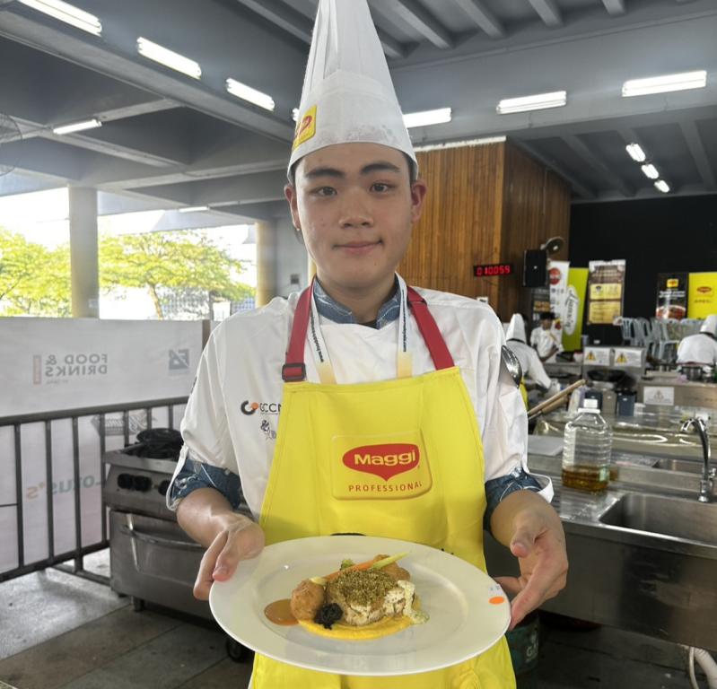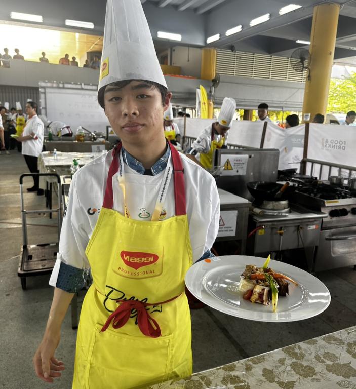 奪下1銀1銅陳昱安,開學前剛完成在臺北米其林一星餐廳實習,他將實習所學習到多元香料運用與烹調技法融入賽事,運用「臺灣春捲皮」包裹圓鱈,創造出酥脆層次感,並製作耗時「荷蘭醬」與「天鵝絨醬(Velouté)」,以多層次味覺與細膩質感征服評審。