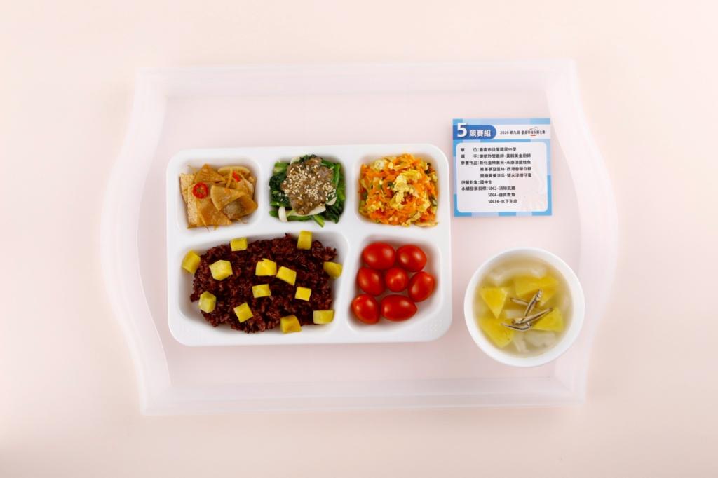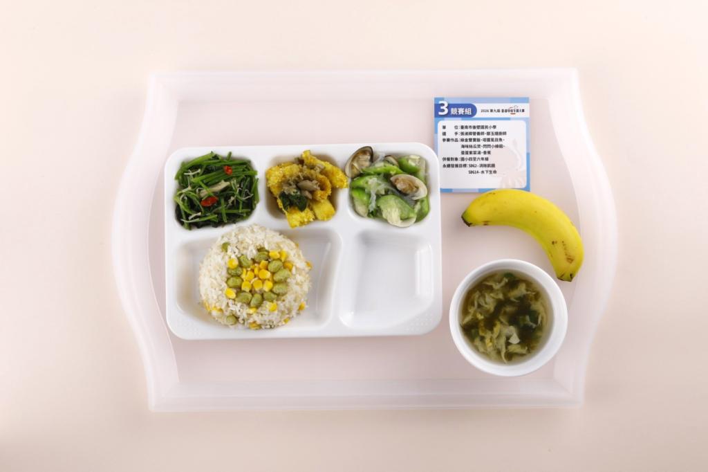 本次競賽中,兩校皆以臺南在地虱目魚為主軸,搭配地瓜、毛豆、鳳梨等在地食材,設計兼具營養均衡、創意巧思與文化意涵校園菜單;後壁國小以「綠金雙寶飯、塔醬虱目魚、海味絲瓜煲」等料理,融合在地米食與多元烹調技法,呈現食材風味並傳遞永續漁業理念;佳里國中則以產地意象命名料理,如「新化金映紫米」、「永康漬國姓魚」等,透過命名與課程設計,引導學生認識家鄉食材與飲食文化,讓學習自然發生於餐桌之中。