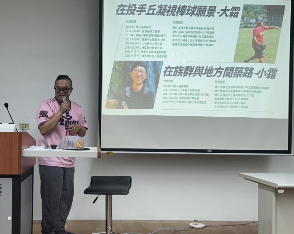 講座中,霜逸祥社工以基隆社區兒少棒球隊的故事為引,分享如何從兒少培力出發,透過運動實踐社會福利理念。