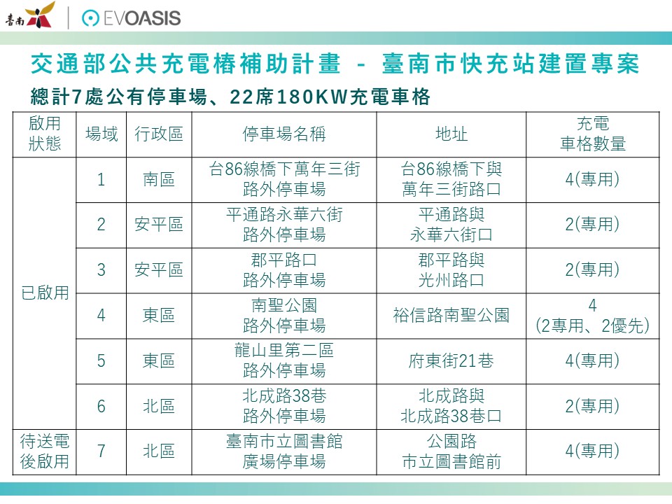 黃偉哲指出,臺南市配合中央2050淨零排放政策,積極爭取中央交通部7,395萬補助經費執行「運具電動化及無碳化策略」,除在各公有停車場廣設充電基礎設施外,並選擇適當地點建置快充站,展現本市推動淨零永續的決心。未來市府將持續佈建充電樁,鼓勵市民使用電動車輛以降低移動污染源,致力於推動能源轉型並提供市民優質交通服務,打造智慧交通、永續、低碳的樂活宜居城市。