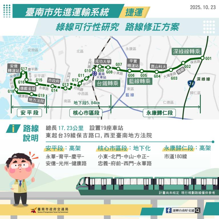 【勁報記者于郁金/臺南報導】臺南捷運綠線可行性研究於今(114)年3月至4月舉辦4場地方說明會後,臺南市政府依據各界的建議,已研議地下段向西延伸出土的新規劃方案,交通局將於114年10月28日辦理第5場地方說明會,歡迎民眾踴躍參加表達意見。