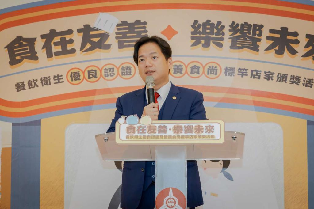 ▲新竹市衛生局舉辦「食在友善.樂饗未來」餐飲衛生優良認證及營養食尚標竿店家頒獎活動。代理市長邱臣遠致詞,肯定業者一同守護食安。(圖/竹市府提供)