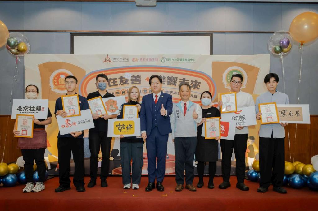 ▲新竹市衛生局舉辦「食在友善.樂饗未來」餐飲衛生優良認證及營養食尚標竿店家頒獎活動。代理市長邱臣遠(左5)、衛生局長陳厚全(右4)和獲獎表揚優良店家合影。(圖/竹市府提供)