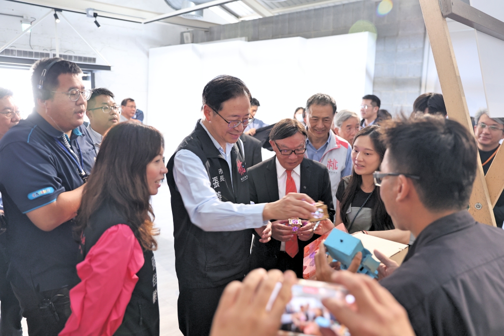 ▲「2025桃園國際新創機器人節」開幕式,桃園市長張善政(中)、祥儀慈善文教基金會蔡逢春董事長和貴賓一同前往齊聚桃園觀光工廠及新創業者呈現豐富市集的產創嘉年華活動。