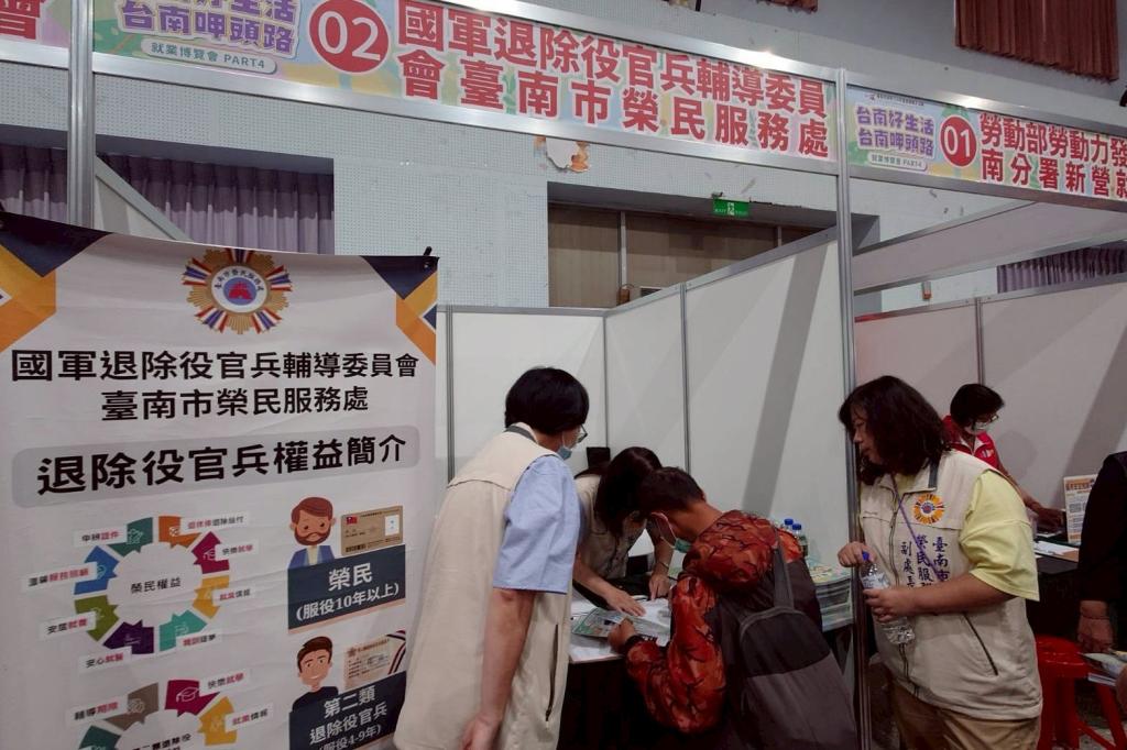 臺南市榮民服務處以攤位形式設定於現場,向退除役官兵介紹相關就業資源及職業訓練方案,徵才活動現場人潮絡繹不絕,服務同仁也逐一的向求職退除役官兵宣導說明輔導會各項就業、職訓及就學等輔導措施,及相關補助、津貼等權益,協助待(轉)業退除役官兵穩定就業,謀求合適好工作。