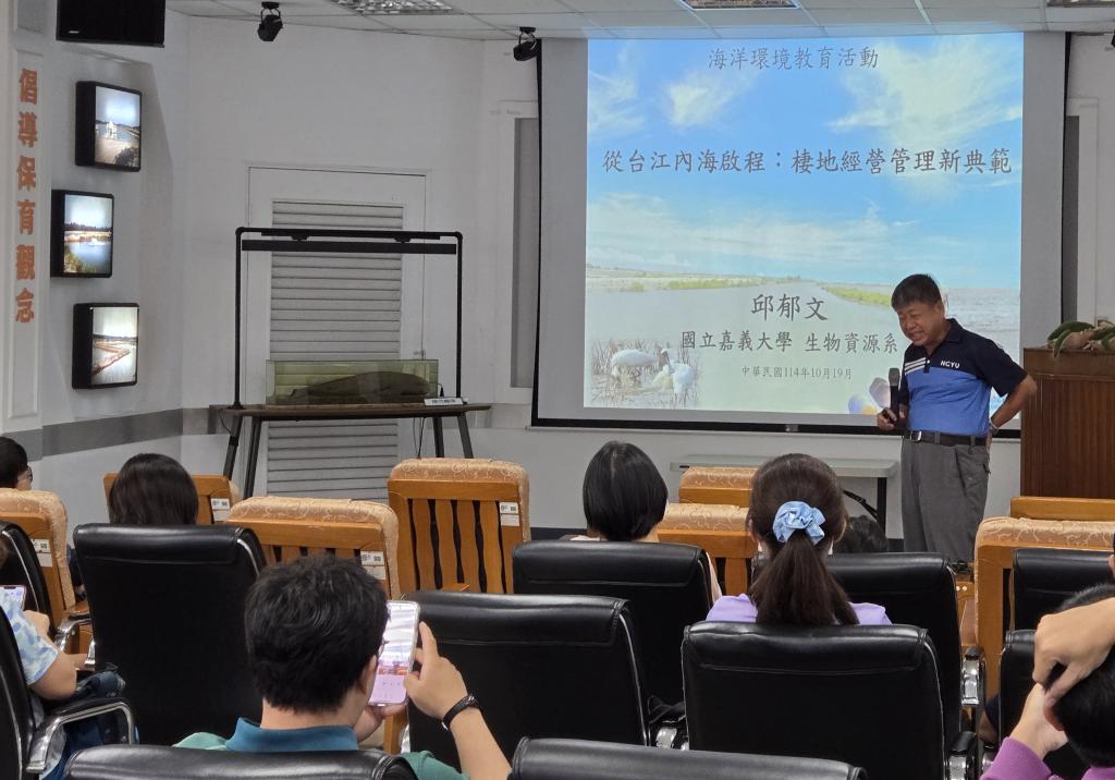 為了宣導棲地永續利用重要性,水試所於日前辦理《從台江內海啟程:棲地經營管理新典範》海洋環境教育活動,邀請嘉義大學邱郁文老師以台江內海棲地經營管理為主題進行分享:從科學數據收集到針對棲地狀態提出管理建議,同時接納在地居民意見持續調整管理措施,找出海洋保育與經濟發展之間平衡點。
