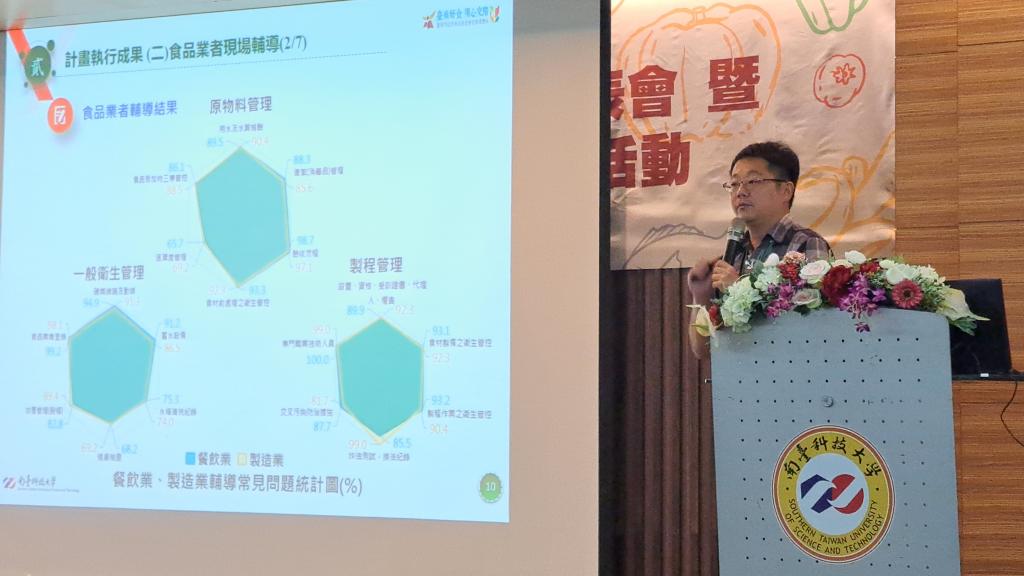 活動現場,黃大維教授進行「食品安全衛生管理體系」成果簡報,衛生局局長李翠鳳親自頒發感謝狀,感謝評核委員專業付出,肯定他們在臺南市食品安全把關方面貢獻。