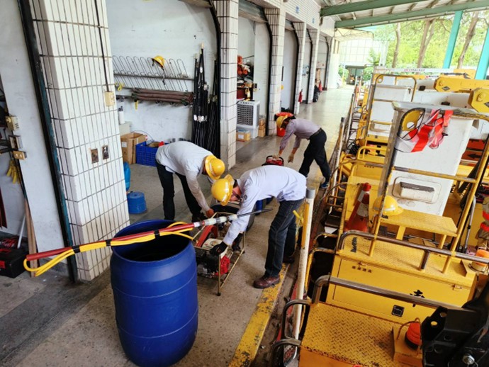 台電新營區處表示,全力戒備,啟動盤點本處相關搶修人力、車輛機具、物料及通訊設備等整備工作,並針對轄區內各變電所進行巡視,於颱風來襲前適時完成防水閘門裝設,並辦理線路特別巡視及對於過密、過高、偏重一側或電力線路沿線樹木進行防颱修剪,以全力待命備戰。