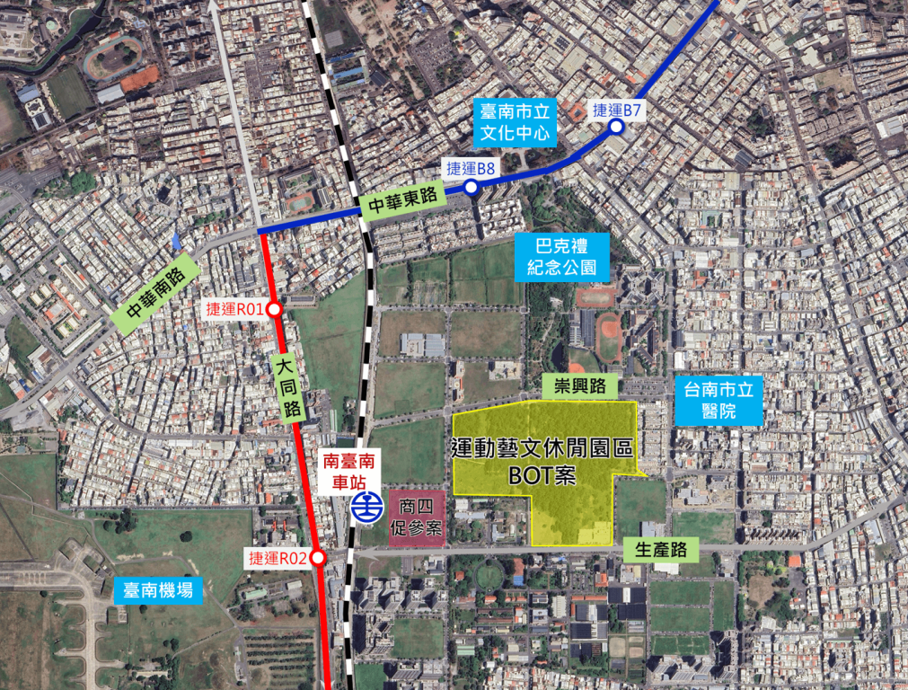 財稅局說明,本案基地位於南臺南副都心區文教用地,面積約14.92公頃;周邊住商區土地開發逐漸蓬勃,基地鄰近臺南機場及預計於120年啟用的鐵路地下化南臺南車站,且周邊有捷運紅、藍線規劃站點,更增添基地通達性;此外,基地亦鄰近臺南市立文化中心、巴克禮紀念公園與市立醫院等,生活機能便利且臻成熟,藉由本案之規劃將本區域串連成生活消費圈。