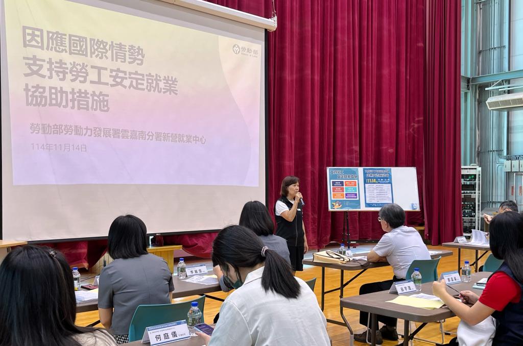 新營就業中心詳細說明,因應關稅而強化「支持勞工安定就業措施」五大內容,包含: