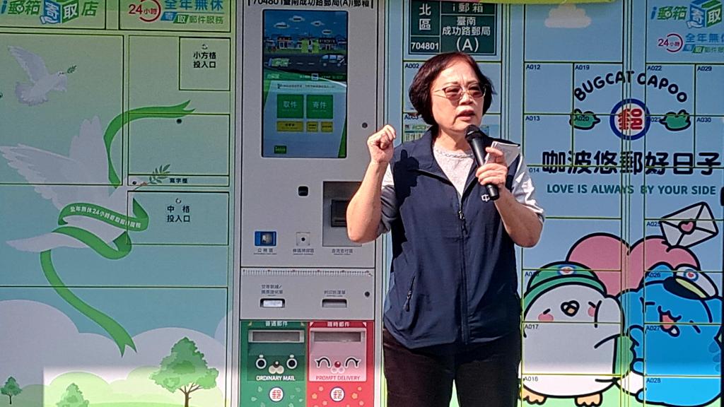 臺南郵局局長梁麗妍表示,為滿足民眾多元用郵需求,打造全自助用郵環境,提供24小時寄取件服務;臺南郵局轄區共有182座i郵箱,本年度起更擴大完成設置善化郵局、學甲郵局等3間i郵箱寄取店及籌備中的5間店,期望未來能為民眾帶來更便捷服務。(于郁金攝)