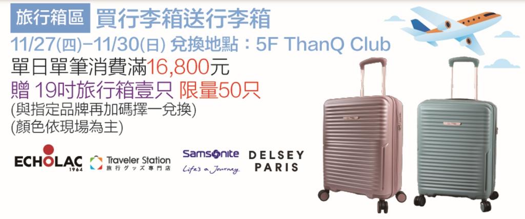 ▲新竹SOGO週年慶11/27-12/8登場,行李箱區單筆消費16,800元,送19吋旅行箱1只(限量50只)。(圖/新竹SOGO提供)