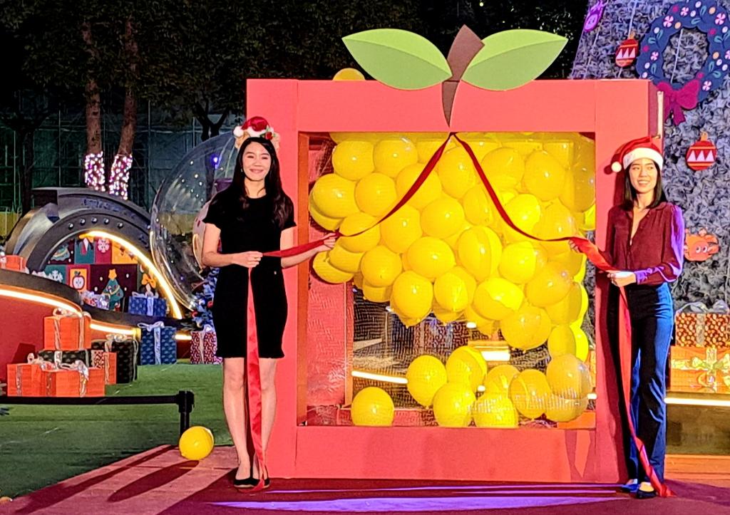 【勁報記者于郁金/臺南報導】「蘋安綻Fun 幸福相遇」!27日晚間18時,南紡購物中心於A2館1F南紡廣場舉辦「點亮南紡點亮愛 解開聖誕夜之光」活動,由瑞復大小聲鼓隊以感動人心「傳愛開幕秀」揭開序幕;隨著點燈時刻到來,南紡購物中心董事長特助侯郁琳、臺南紡織公司董事侯郁瑢齊心拉開蘋果造型放飛氣球禮物盒彩帶,250顆氣球瞬間飛向天際,正式點亮「蘋安綻Fun幸福相遇」主題展區。