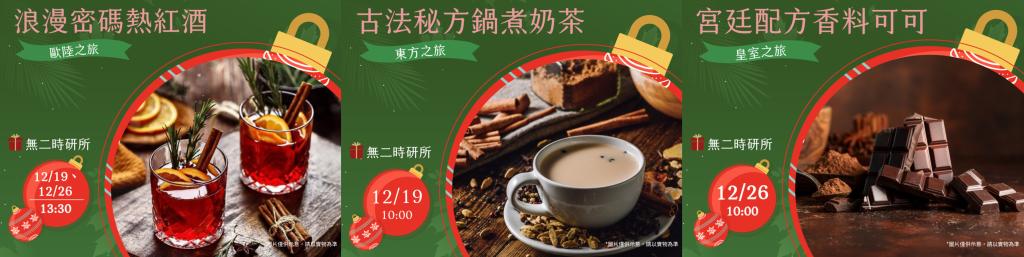 此外,「無二會所」為歡慶聖誕節,亦以耶誕主題時研所帶來限定新品,冬季必備的大人系暖心飲料「香料熱紅酒、鍋煮奶茶與香料可可茶」一次備齊。民眾可以品嚐講師精選的各式調飲,從大稻埕香料市場出發、跟著香料的故事環遊世界,並趁著餘韻猶在調製出專屬香料茶酒包與獨家配方,讓這個溫暖而魔幻的午後無限延續。