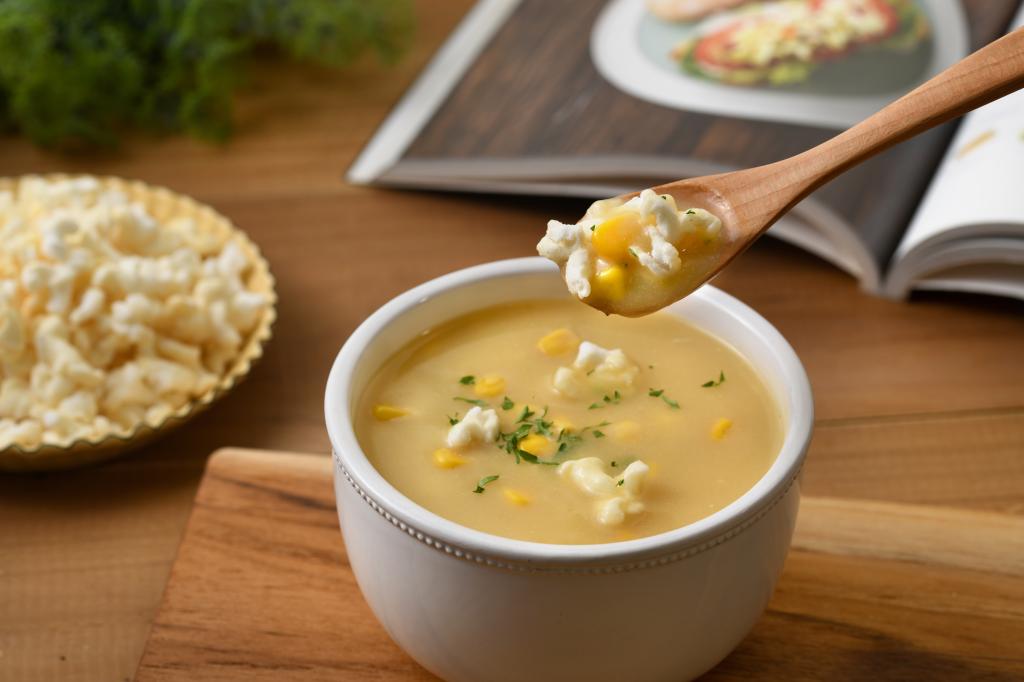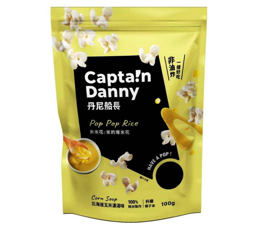圖說:台灣品牌「丹尼船長 Captain Danny」的米米花,回購率第一名的 「北海道奶油玉米濃湯味」丨這款米米花以 台灣米製作、非油炸,口感輕脆不卡牙,奶油玉米濃湯味香氣濃郁。