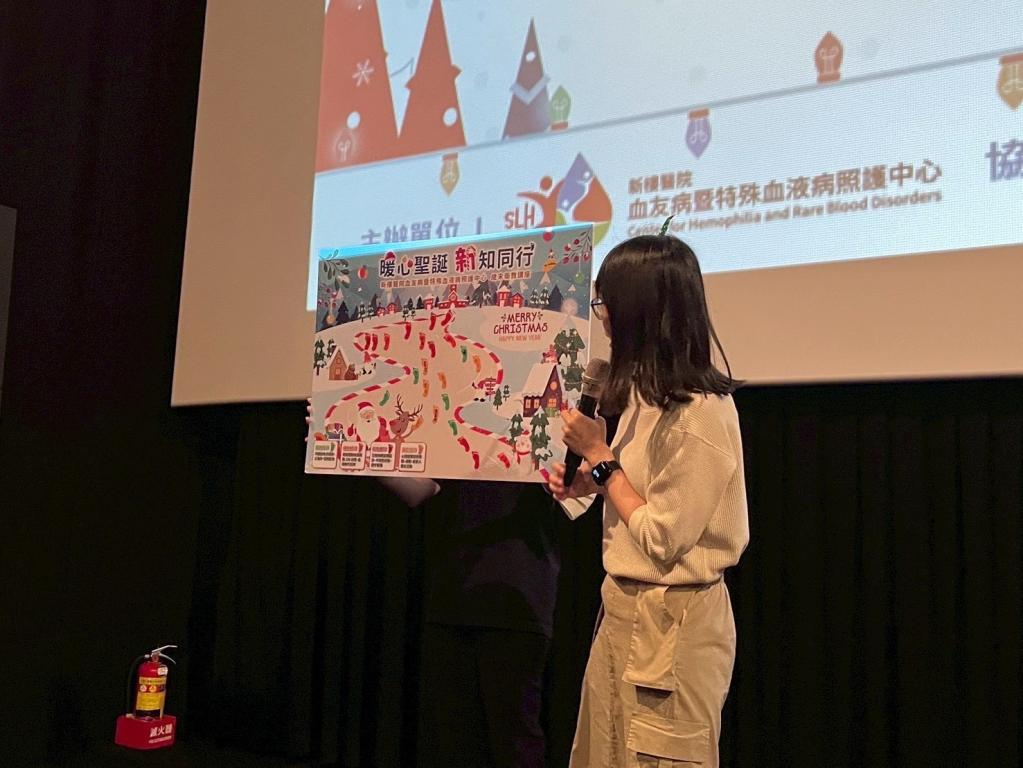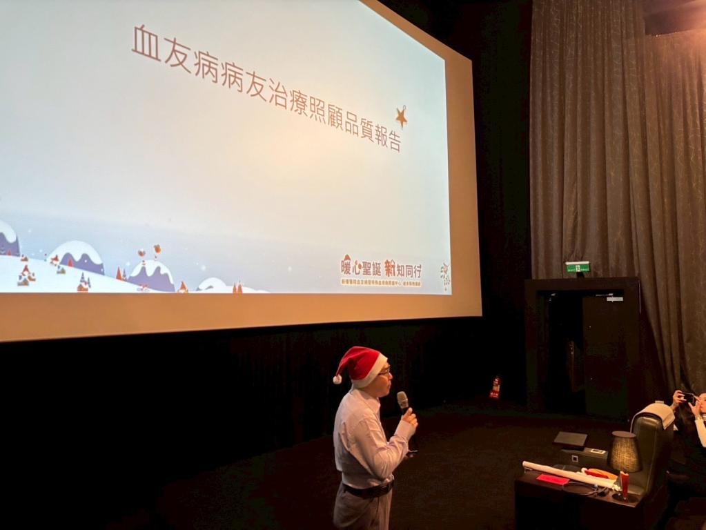 在電影開始前,本中心主任林家義醫師分享台南新樓血友病病友照護品質,及新型長效干擾素治療骨髓增生性腫瘤長期追蹤成果,回顧114年度中心舉辦各項活動花絮,除了身體上照護,也照顧病友及家屬心靈,辦理多場我知故我在靈性課程,明年會新增正向咖啡活動,持續關注病友及家屬心靈,心念轉化對病情是有幫助,期望藉由心靈維度提升改變生理不適。