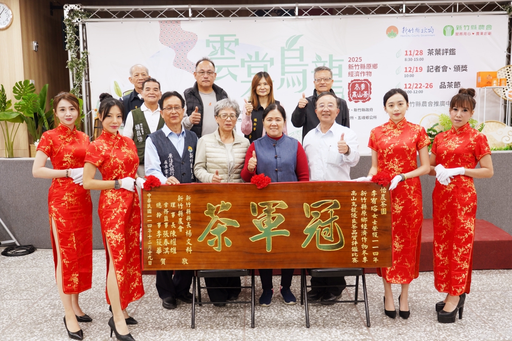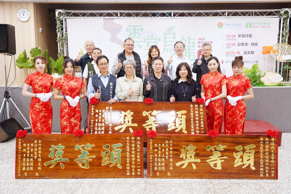 在原住民族委員會和新竹縣政府的支持下,新竹縣農會帶領尖石鄉公所、五峰鄉公所等原鄉地區之茶農,今(12/19)日於新竹縣農會三樓活動中心舉辦第七屆「114年新竹縣原鄉經濟作物冬季高山烏龍茶優良茶評鑑記者會暨頒獎典禮」,茶農涂旭帆拿下特等茶與冠軍茶雙獎為最大贏家,怡農茶園李宥瑢也喜獲冠軍茶及頭等獎,另一名冠軍茶得主則為甲子園盧瑞祥,新竹縣農會邀請大家12月22日至12月26日到縣農會體驗雲裳烏龍茶好風味!