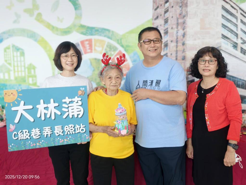 圖/來自大林蒲 C 級巷弄長照站、高齡 92 歲的黃楊秀霞阿嬤。阿嬤在據點裡不僅跟著大家一起做「樂齡打擊樂」訓練節奏感,更透過精細的手作課程鍛鍊手眼協調,完美詮釋了「活到老、動到老、玩到老」的樂齡精神 。(左起大林蒲鳳興里辦公室的幹事蔡麗芬小姐、、92 歲的黃楊秀霞阿嬤、大林蒲鳳興里的里長洪富賢里長、大林蒲長照志工魏麗花小姐)
