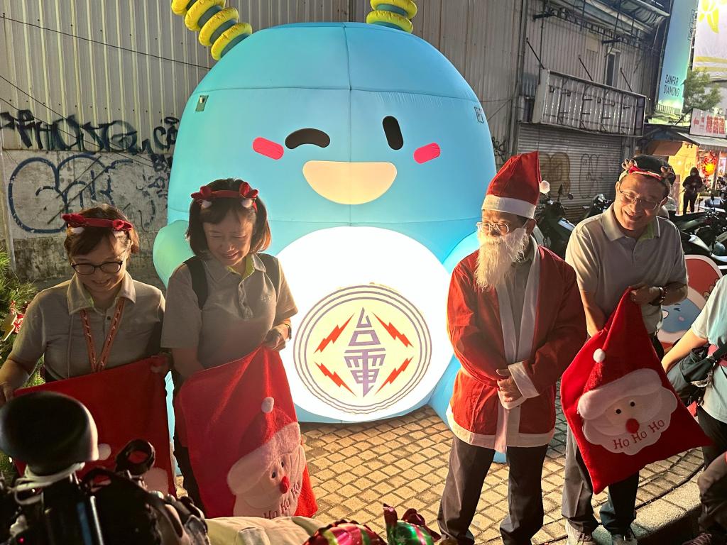 2025海安聖誕日以「糖果森林」為主題,20日晚於臺南海安商圈盛大開幕,現場集結上百個市集攤位,營造商圈浪漫聖誕氛圍;台電副總經理陳銘樹也來到現場,與各界貴賓共同為活動揭幕,並與節電吉祥物電寶同台和民眾熱情互動,進行趣味節電問答。