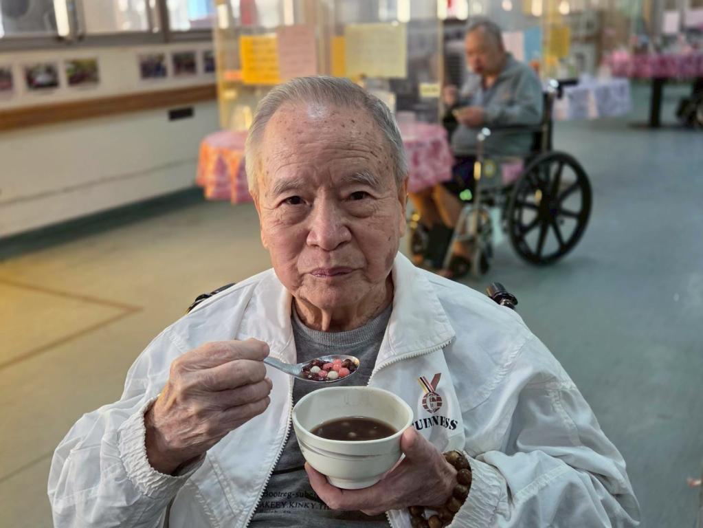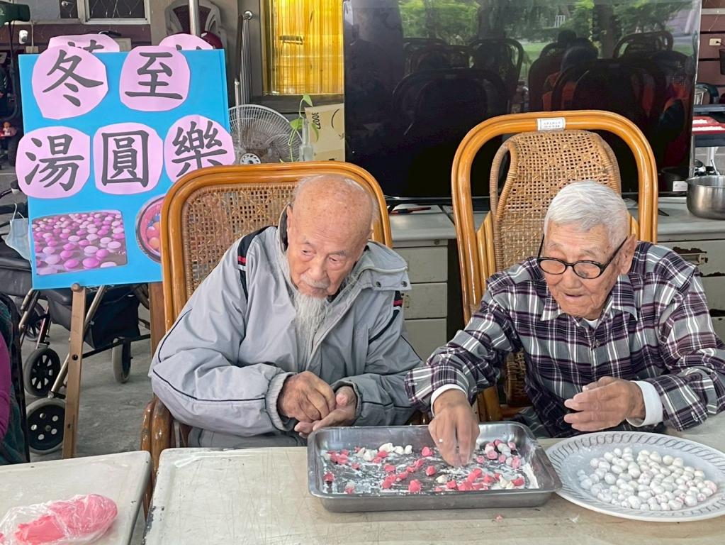 現年102歲人瑞黃伯與楊伯也專注地搓著紅湯圓,一顆顆圓潤湯圓承載著歲月記憶與祝福;熱騰騰甜湯圓端上桌時,長輩們細細品嚐,臉上露出滿足笑容,彷彿回到昔日與家人圍坐共享節慶時光。