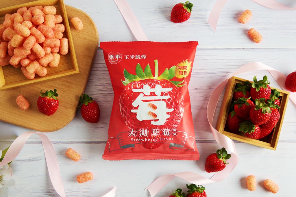 本次新品的最大主角「乖乖玉米脆條-大湖草莓」,一開袋即可聞到新鮮草莓般的自然香氣。這款產品特別選用苗栗大湖國產草莓,將台灣土地的味道融入酥脆的經典玉米脆條中。