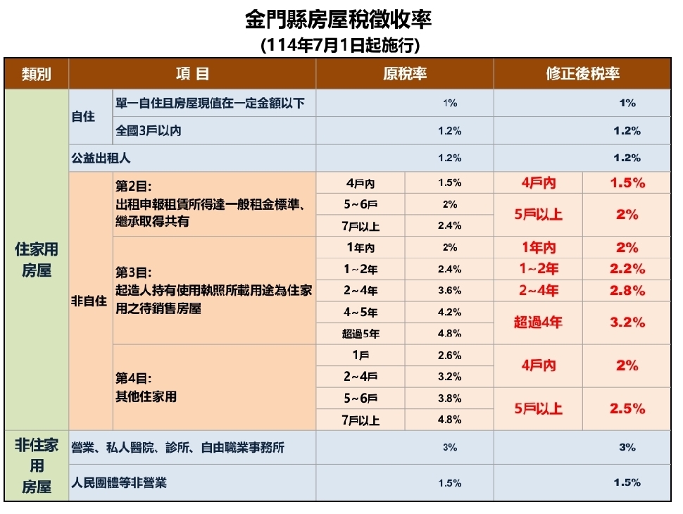 財稅局指出,陳福海縣長體恤民情,指示應考量金門之特殊性,稅率之核算應力求全國最低,爰在兼顧落實居住正義及租稅公平下,下修非自住住家用房屋差別稅率如下(詳附表):