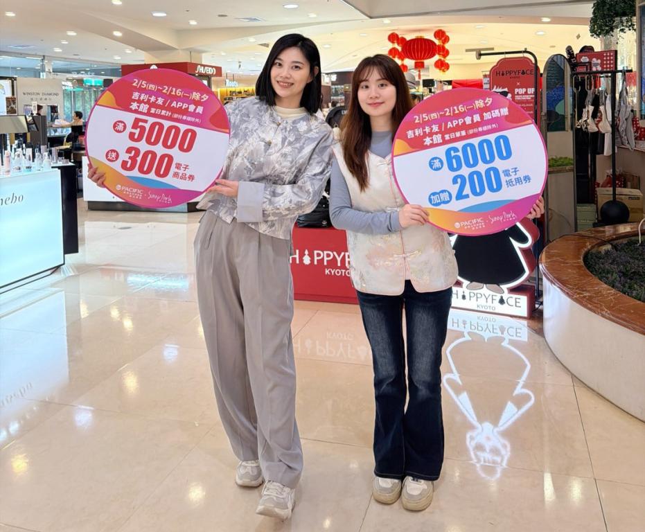 【勁報記者于郁金/屏東報導】馬年到來,屏東太平洋百貨與您最麻吉!當然要好好回饋給所有最麻吉卡友/會員朋友,於2/5(四)~2/16(一)除夕舉辦春節檔期滿仟送佰活動,活動期間吉利卡友/APP會員於本館(部份專櫃除外)當日消費累計滿5,000元即贈太平洋百貨電子商品券300元乙份,滿10,000元贈兩份,以此類推;當日單筆滿6,000元再加贈電子抵用券200元,年前採買化妝品、新衣、年貨或團圓聚餐,立馬前往屏東太平洋百貨,讓您新的一年「都馬有吉$」!