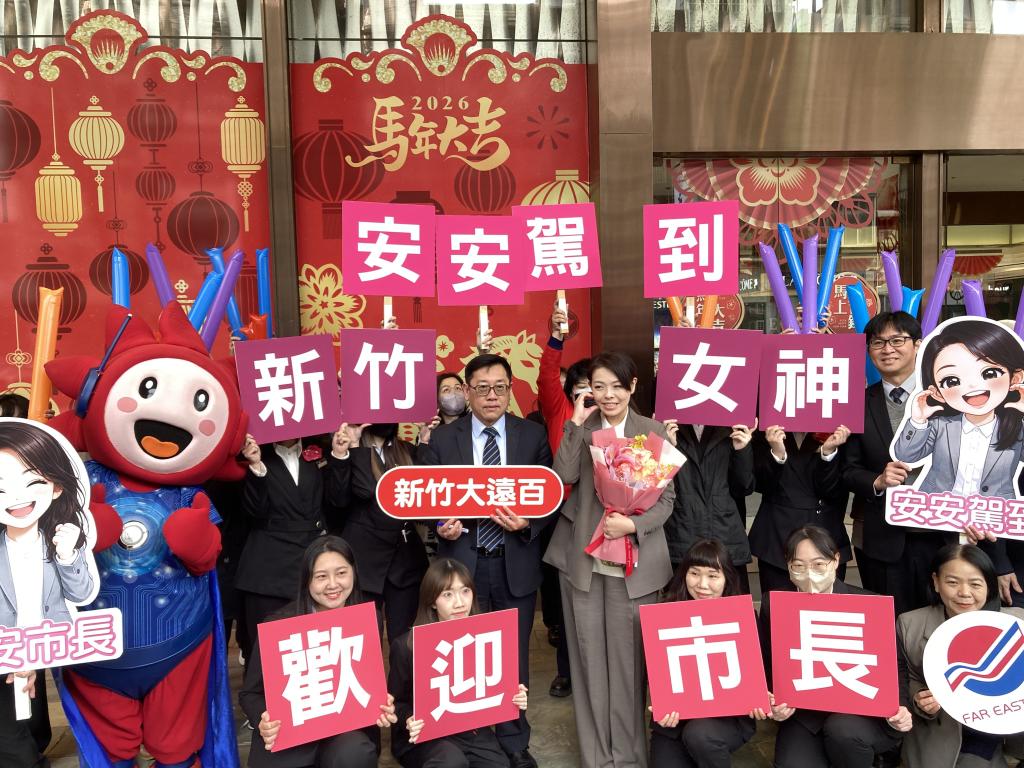 ▲竹市府於新竹大遠百舉辦「中獎人頒獎暨績優店家感謝活動」,新竹大遠百店長李正方率領同仁在廣場歡迎高市長到來並合影。