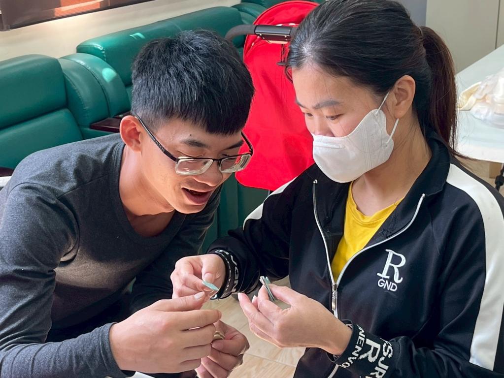 在體驗製作「金馬報喜」福袋鑰匙圈環節中,新住民夫妻需不斷穿引蠟線、溝通合作,象徵好運奔騰皮雕方能縫製得整齊美觀;正如柴米油鹽間平凡歲月,唯有尊重與包容,關係才能穩固長久。