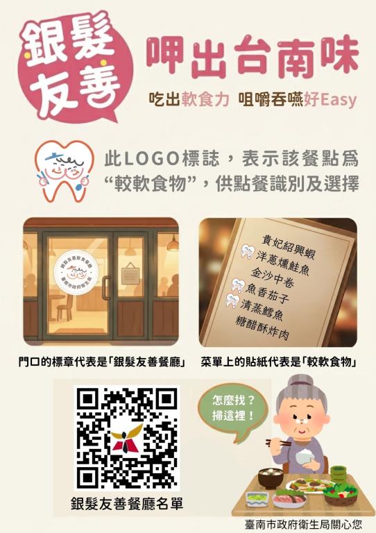 衛生局表示,誠摯邀請市民朋友多加利用銀髮友善餐廳資源,透過線上回饋機制分享用餐經驗與建議,讓我們更貼近民眾需求,持續優化銀髮友善餐飲政策;「銀髮友善餐廳」名單請參考網址「https://p.tainan.gov.tw//zpBoY2」。(臺南市政府衛生局提供照片)