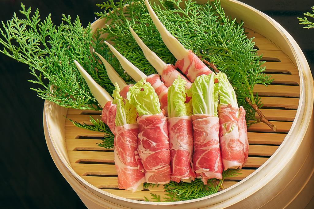 圖說:「和饗大皿盛-賞櫻之宴」的蒸籠料理集結日本各地人氣海陸食材,圖為豬肉蔬菜卷蒸騰上桌。