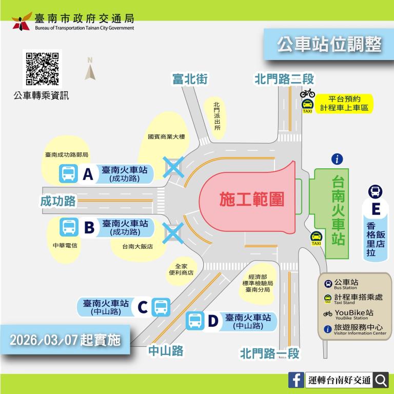 本階段台南火車站前站之汽、機車臨時接送區維持現有地點,另為疏散停等車輛,3月7日起新增於圓環北側(近北門派出所路段)增設汽、機車接送區,請依牌面指示臨停,不得久佔,同時呼籲民眾多加使用後站接送分流。