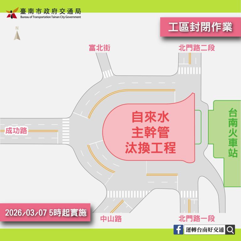 局長王銘德說明,施工單位預計自3月6日(五)夜間11時起至翌日5時止暫時封閉火車站前道路鋪設路面及重繪標線,封閉路段包括北門路一段與民族路一段口、北門路二段與北忠街口、中山路與西華南街口、成功路與西華街口、富北街及北忠街路口等5路口之範圍內,屆時車輛將無法行經圓環;另於道路封閉期間搭乘台鐵區間3297、3291、3287、5099、3294、3292、3288、3784、3782、3786、自強181、149等班次的旅客僅能步行進出前站,接送及轉搭其他交通工具的旅客請由前鋒路後站進出。