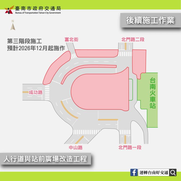 交通局長王銘德表示,站前圓環改造是本市重大工程之一,由於站前圓環是市區交通樞紐,市長黃偉哲已指示交通局務必做好交通規劃,確保工程順利推進,並減少施工期間對民眾影響,日前第一階段已請工務局、自來水公司針對既有圓環分隔島、植栽移除及汰換老舊自來水管線先行作業,本次第二階段即將進入自來水主幹管汰換及主體廣場工程,預訂於115年3月6日(五)夜間23時起進場施工,並將會更動現有圓環行車動線。
