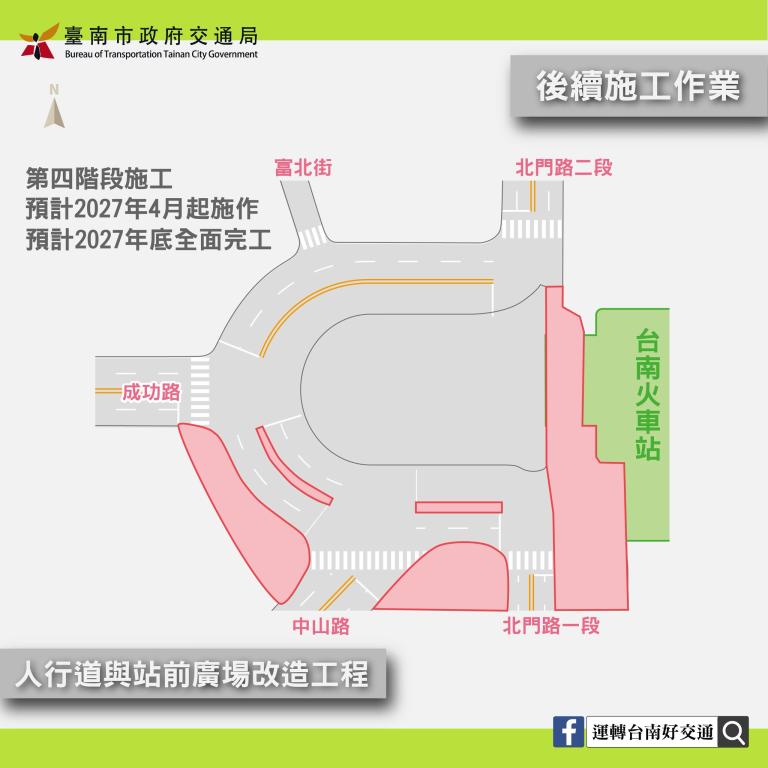 行人動線在本階段大致維持現況,但3月7日起在北門路二段路口新增行人穿越道線,在廣場完工開放通行前,可增加行人往來火車站和各街廓便利性。
