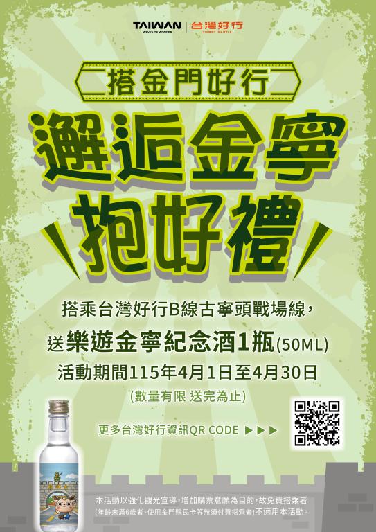 率先啟動的是金寧公所與金門縣車船處合作推出「邂逅金寧抱好禮」活動;4月1日至4月30日期間,凡搭乘台灣好行B線—金寧鄉古寧頭戰場線,完成導覽行程後,即可獲贈由鄉公所限量特製「樂遊金寧紀念酒」乙瓶,數量有限,送完為止,藉此鼓勵民眾透過公共運輸深入認識金寧之美。