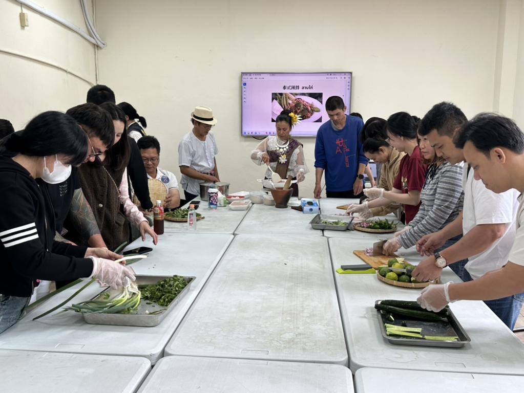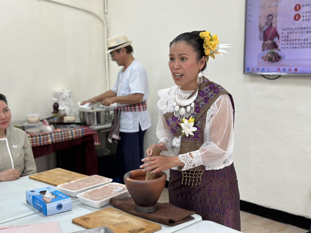在泰國新年習俗中,吃「laab」(音似中文「辣」,為菜名)寄託著吉祥與福氣,大家聞言紛紛捲起袖子,實作泰北經典料理「糯米辣拌雞」;各國學員在備料與談笑中熱絡交流,將現燙雞肉拌入香菜、檸檬和薄荷等食材,而後手持傳統擂缽搗碎炒糯米,撒上後完成擺盤,瞬間香氣四溢。