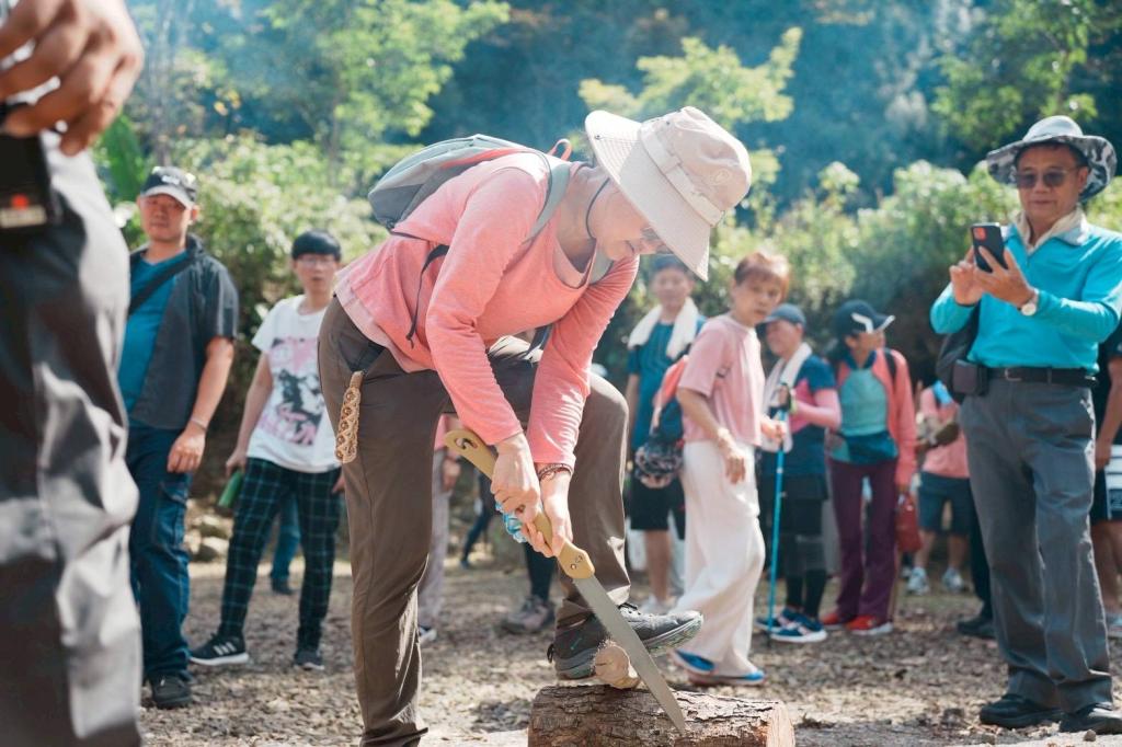 ▲Hatala!出發吧!苗栗南庄部落健行500位旅人齊步探索石壁部落趣!旅人們於折返點體驗原民鋸木。(圖/參山處提供)