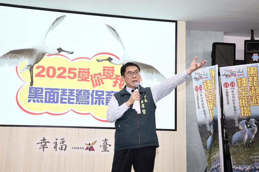 【勁報記者于郁金/臺南報導】國際保育候鳥「黑面琵鷺」於今年9月已陸續飛抵臺南棲息度冬,由臺南市政府主辦「2025黑面琵鷺保育季」系列活動,將於10月26日登場,市長黃偉哲於15日在民治市政中心舉辦記者會,述說臺南對黑面琵鷺保育工作顯具成果,並重申保育工作需全民參與,歡迎各地民眾來臺南觀賞黑琵和各種冬候鳥,體驗生態旅遊,也大飽口福品嘗新鮮海產和各地方美食。
