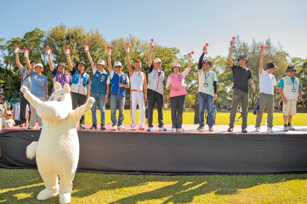 ▲桃園市觀光旅遊局主辦的秋季限定活動「2025大龍門鱻漫遊嘉年華」,今(10/18)日於石門大草坪盛大登場,由桃園市政府王明鉅副市長(左7)主持開幕儀式,並和與會貴賓及芬蘭知名IP「姆明一族(MOOMIN)」一同合影。(圖/桃園市觀光旅遊局提供)