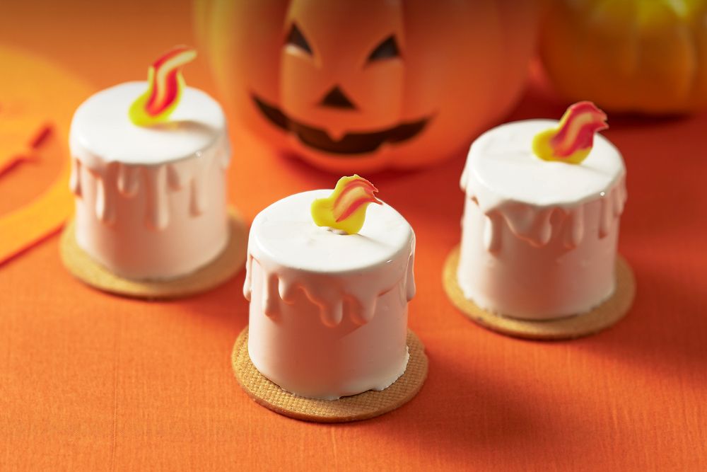 圖說:JR東日本大飯店台北萬聖節推出的「南瓜白巧克力慕斯(厄夜蠟燭)」(240元)將法芙娜白巧克力與香草杏桃凍結合,口感柔滑細膩,如夜色裡的一縷燭光。