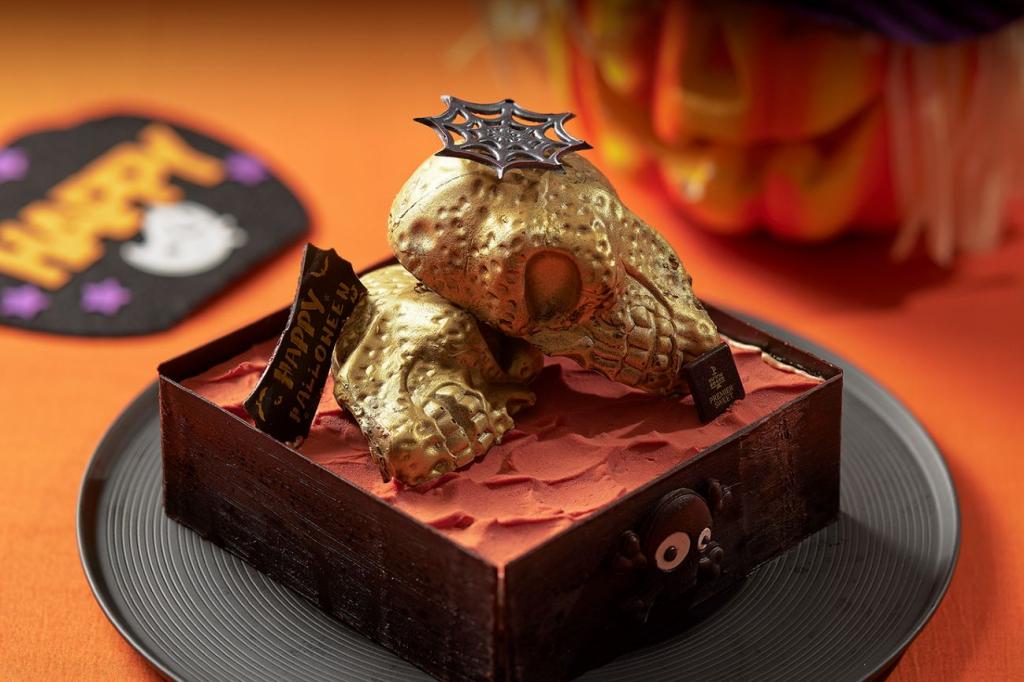 圖說:JR東日本大飯店台北萬聖節推出的「南瓜堅果歐培拉」(6吋/1,200元),以花生醬、榛果醬與新鮮南瓜泥交織出綿密層次,加上骷顱造型巧克力為經典Opera蛋糕注入萬聖節慶靈魂。