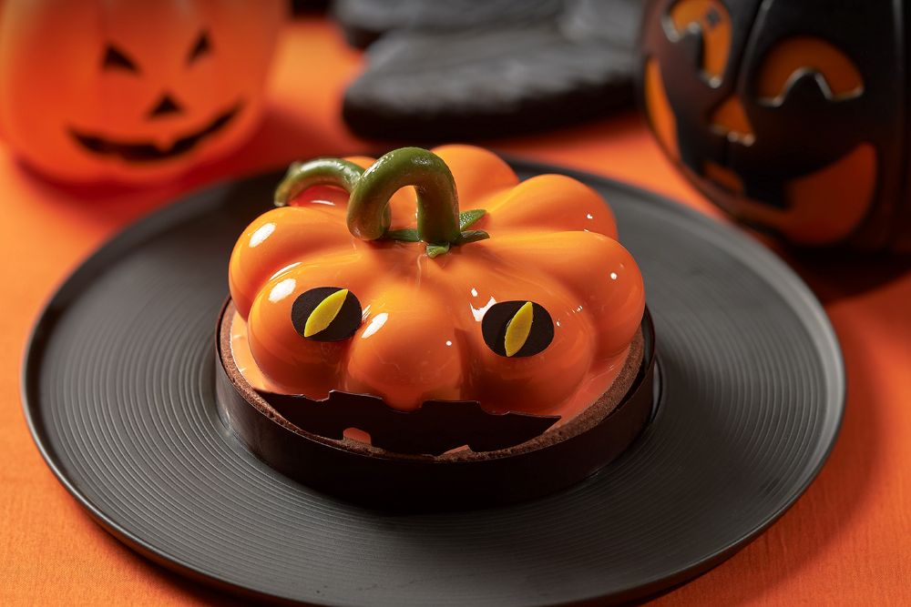 「南瓜堅果歐培拉」以花生醬、榛果醬與新鮮南瓜泥交織出綿密層次,加上骷顱造型巧克力為經典Opera蛋糕注入萬聖節慶靈魂。「楓糖南瓜派(傑克南瓜)」融合絲滑布蕾與輕盈慕斯,佐以香烤南瓜子與楓糖漿,甜潤細膩如秋風輕拂。「南瓜白巧克力慕斯(厄夜蠟燭)」將法芙娜白巧克力與香草杏桃凍結合,口感柔滑細膩,如夜色裡的一縷燭光。「焦糖巧克力慕斯(血紅骷髏)」則以濃郁慕斯包裹焦糖醬與巧克力脆皮,層次香氣豐富、餘韻悠長。