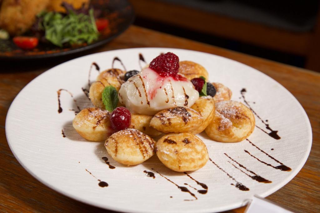 壓軸甜點「荷蘭莓果小鬆餅」鬆軟微甜,灑上糖粉與莓果,甜而不膩,彷彿冬季市集的幸福氣息。