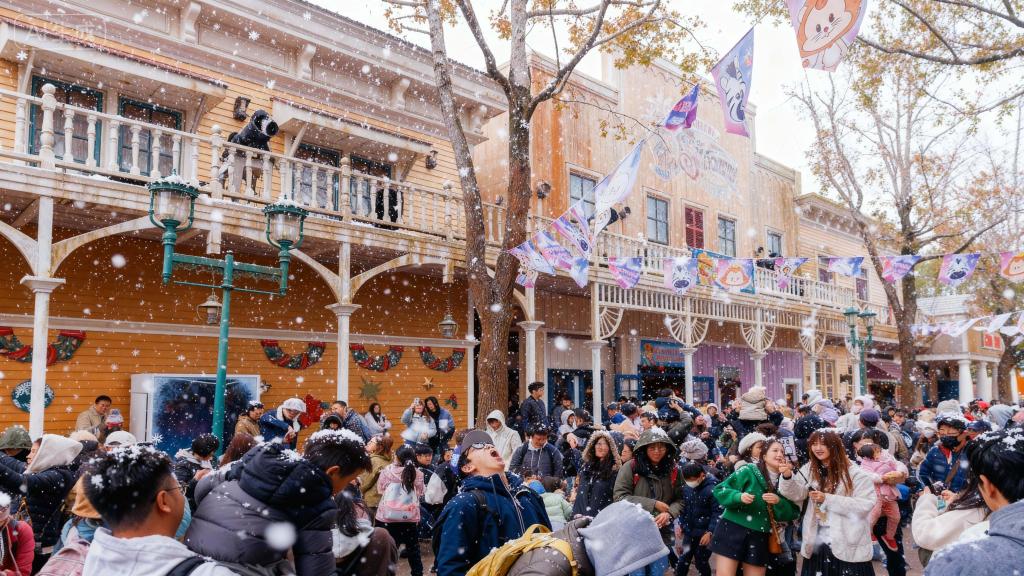 ▲冬季限定園區街道上紛飛的雪花帶來濃厚過節氛圍,吸引大批遊客駐足拍照、感受彷彿置身童話小鎮般的夢幻雪景。(圖/六福村提供)