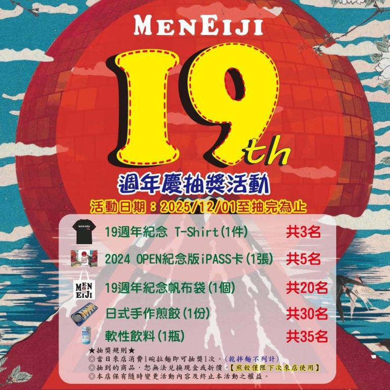 為慶祝 19 週年,MEN-EIJI Taiwan 特別推出 「周年慶限量抽獎活動」,活動期間至桃園店用餐消費,即可獲得抽獎資格,有機會拿到限量周邊、品牌紀念品或免費餐食券等,特別是限定品牌上衣、側背包這兩位款,不僅設計十分潮,獲獎者更可以享「永久」可憑穿搭此衣服或包包,至北海道總店享一碗拉麵免費的優惠喔!這些活動安排別具意義、精彩可期,旨在回饋支持 MEN-EIJI 多年的粉絲,也象徵品牌邁入新階段的重要里程碑。
