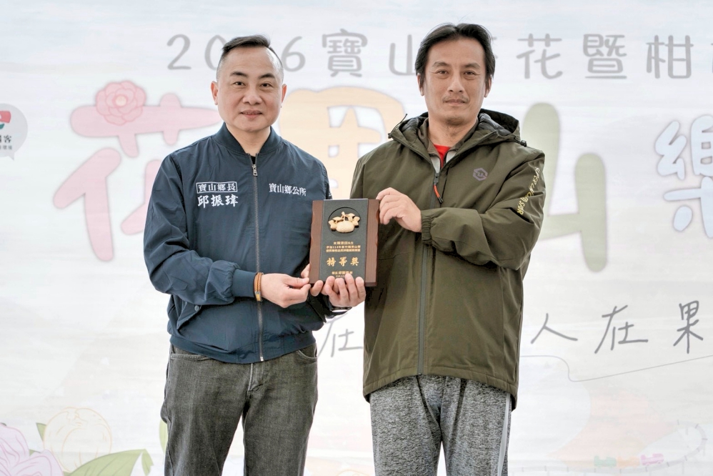 ▲竹縣寶山鄉公所「2026寶山茶花暨柑橘節」盛大登場,寶山鄉長邱振瑋(左)頒發特等獎給獲獎的優秀果農。(圖/寶山鄉公所提供)
