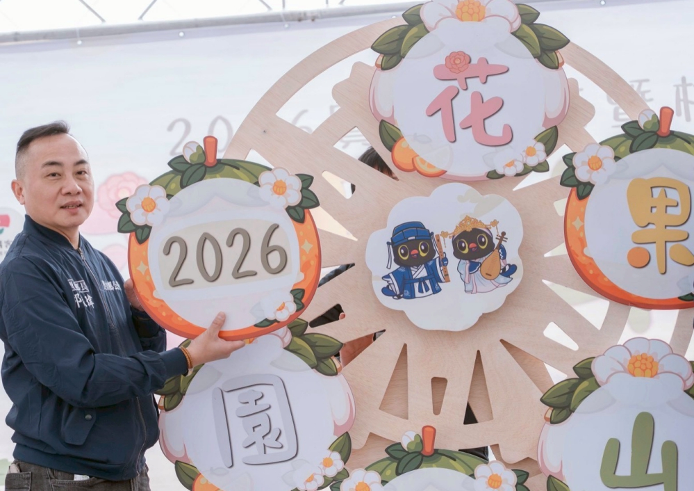 ▲竹縣寶山鄉公所「2026寶山茶花暨柑橘節」盛大登場,寶山鄉長邱振瑋在活動主題「花果山樂園」貼上2026手牌,正式為此次活動揭開序幕。(圖/寶山鄉公所提供)